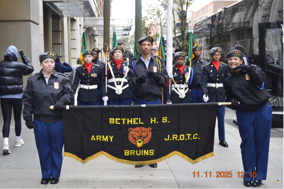 The Bethel High School Army JROTC “Bruin Battalion” traveled to New York City (NYC) to proudly march in the annual NYC Veterans Day Parade. The parade committee selected our Bruin Battalion because of the cadets’ outstanding scholarship, exemplary community engagement, and consistent demonstration of high moral character.