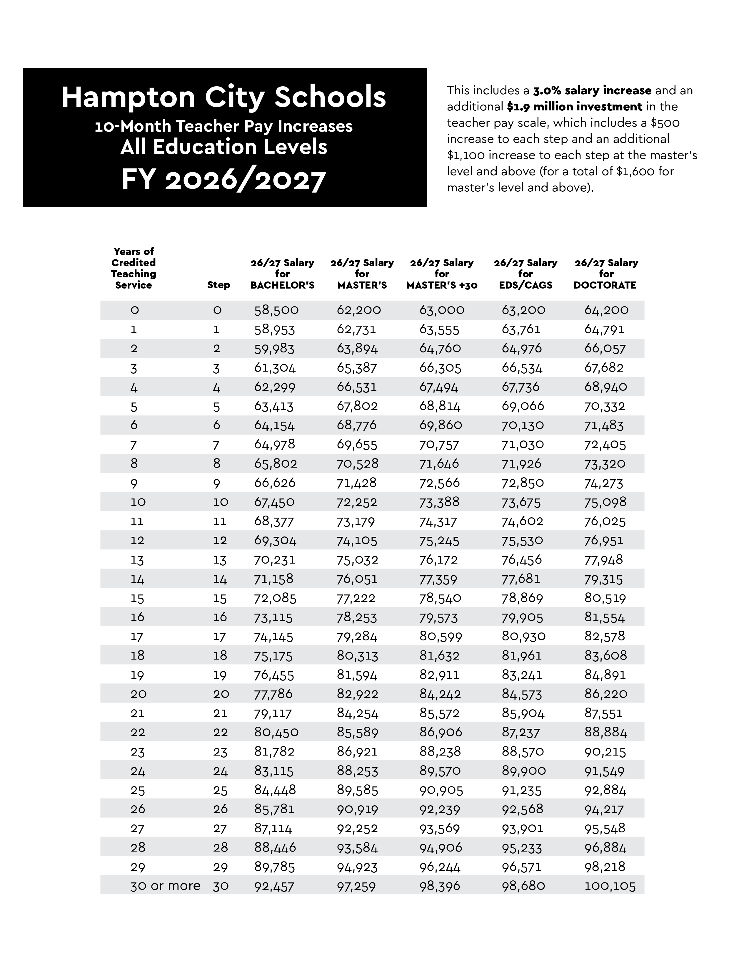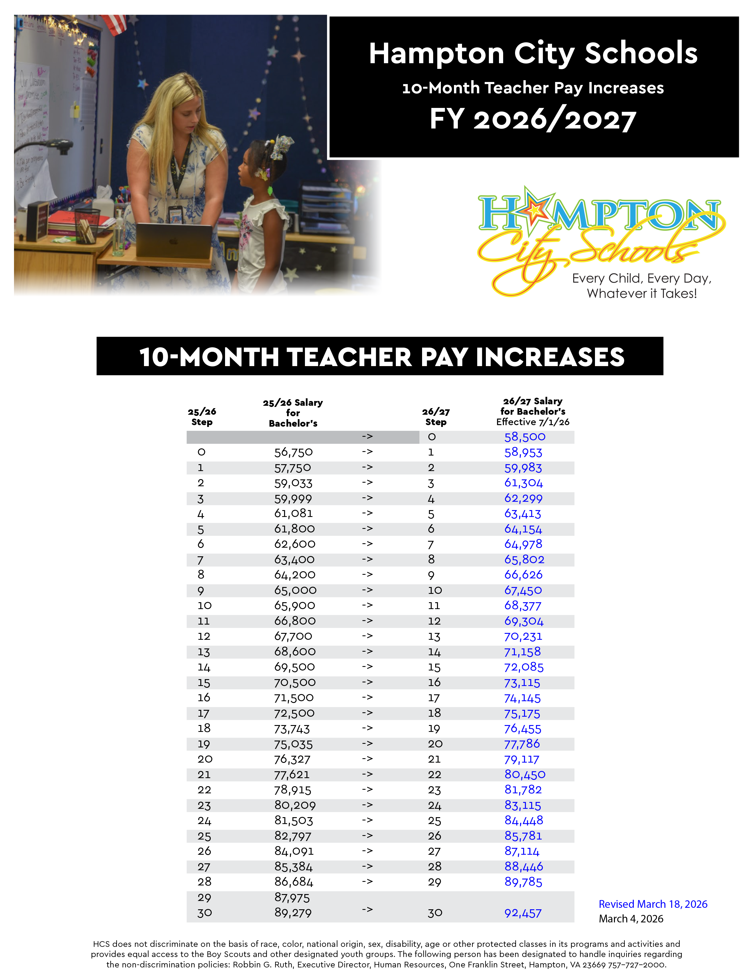 A: Leveraging the Governor’s proposed funding and strategically reallocating resources within our existing HCS budget, Hampton City Schools is recommending a three percent (3%) salary increase for FY 2026–2027, effective July 1, 2026. This increase applies to all full-time employees and the majority of part-time employees — exceeding the Governor’s proposed two percent (2%) adjustment.