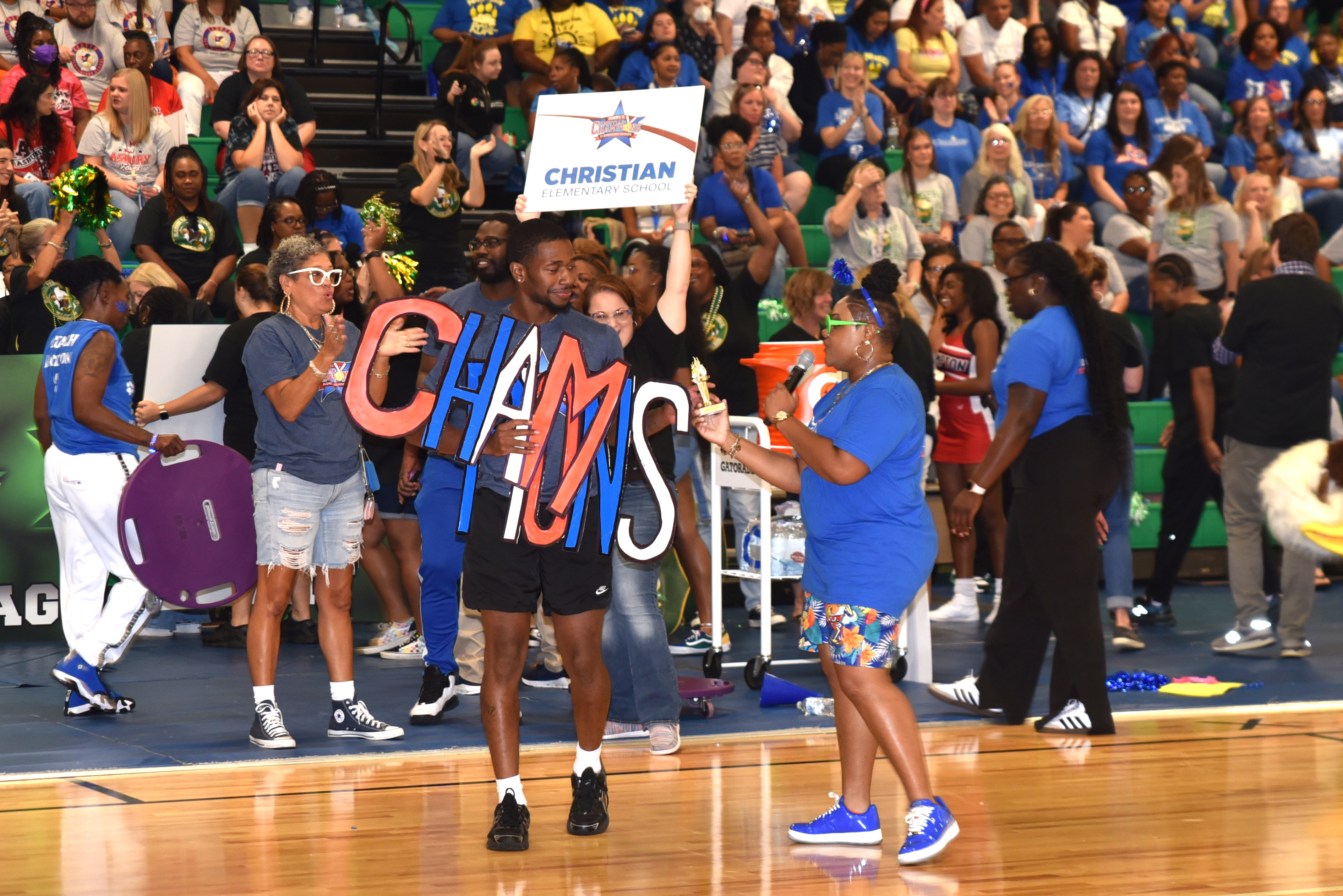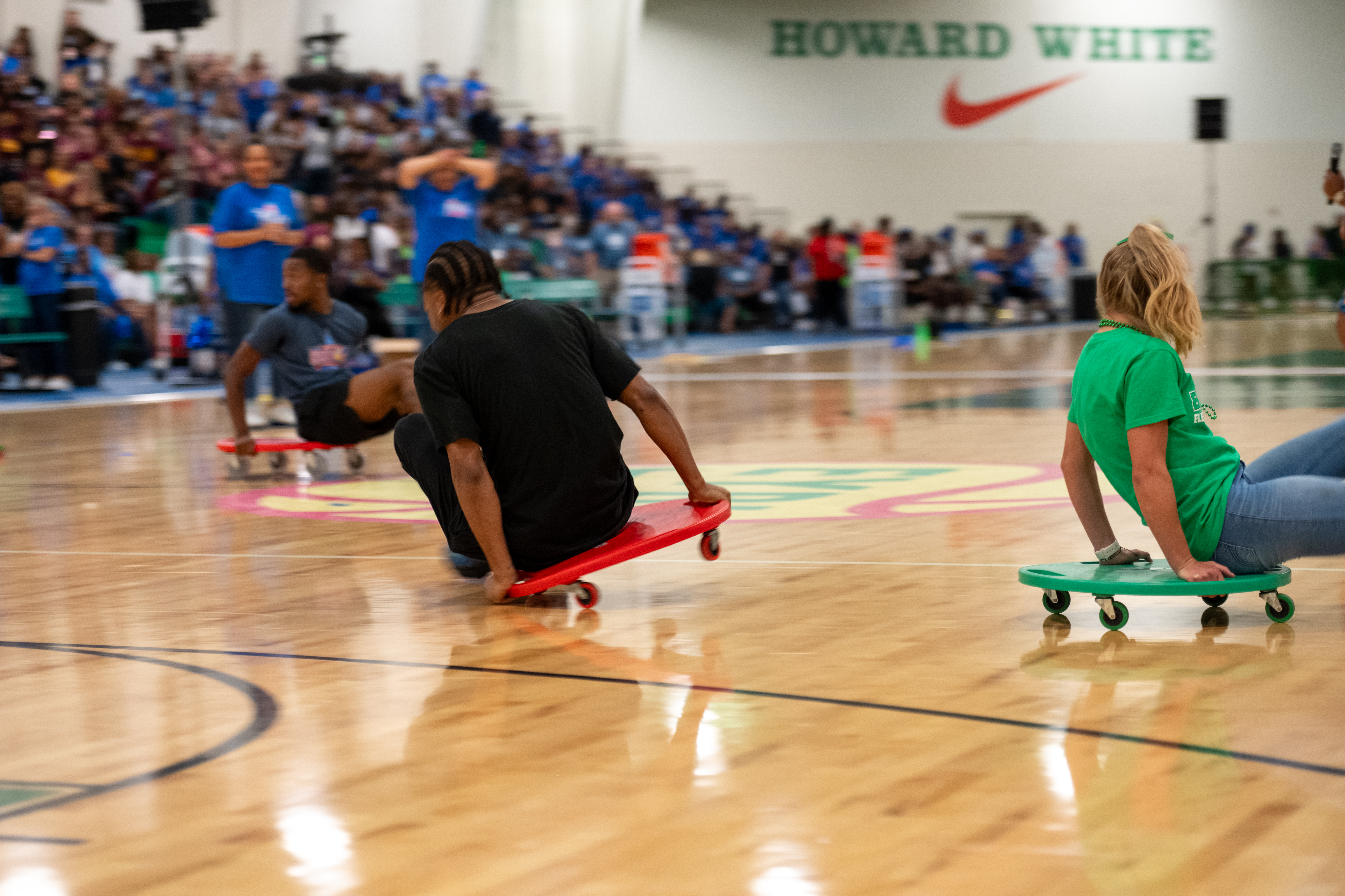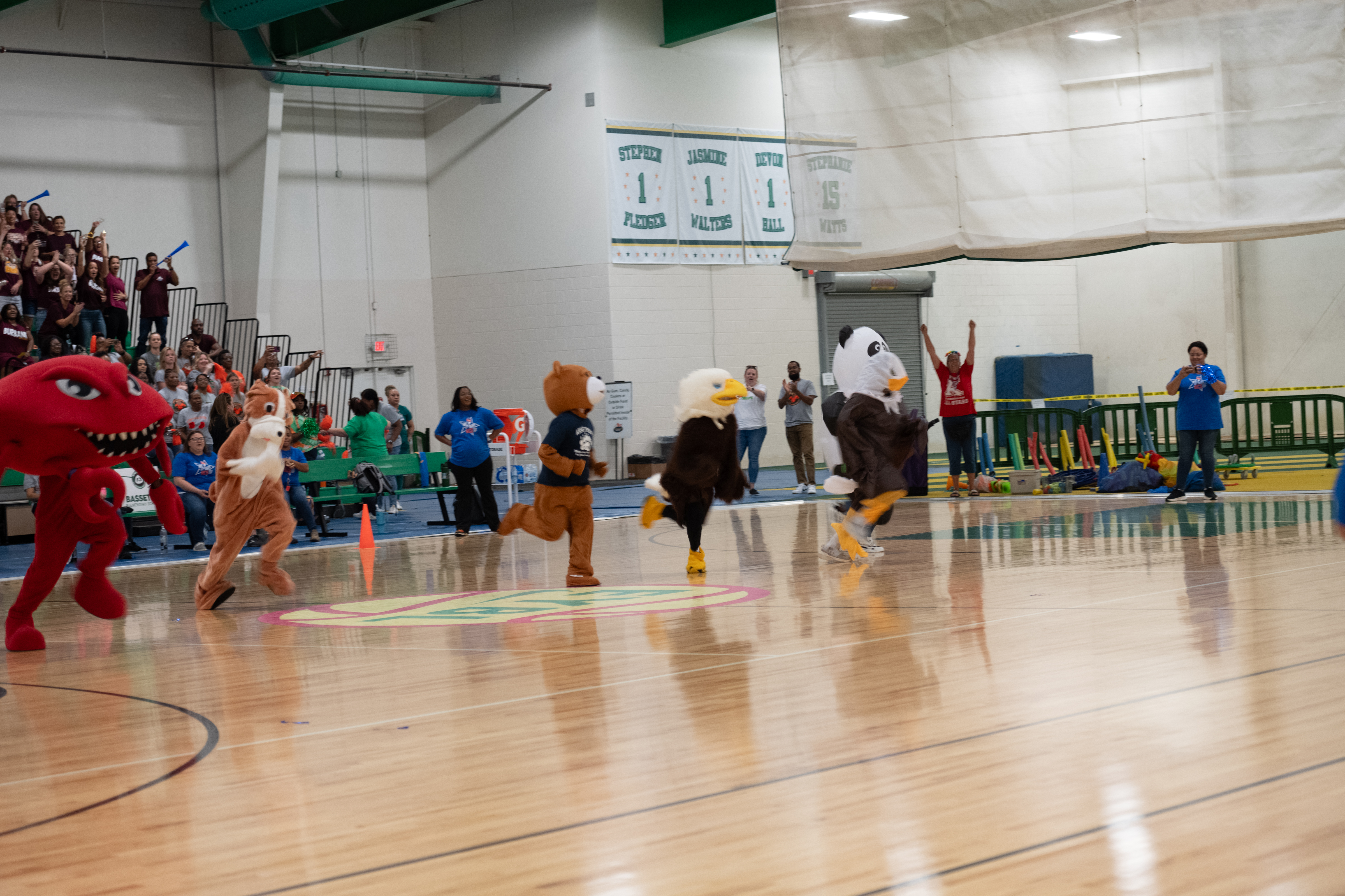 Throughout the event, the emcees shared accomplishments of both individual staff members and schools and departments. Schools and departments also participated in some lively competitive fun to include a mascot race, scooter races, and more.