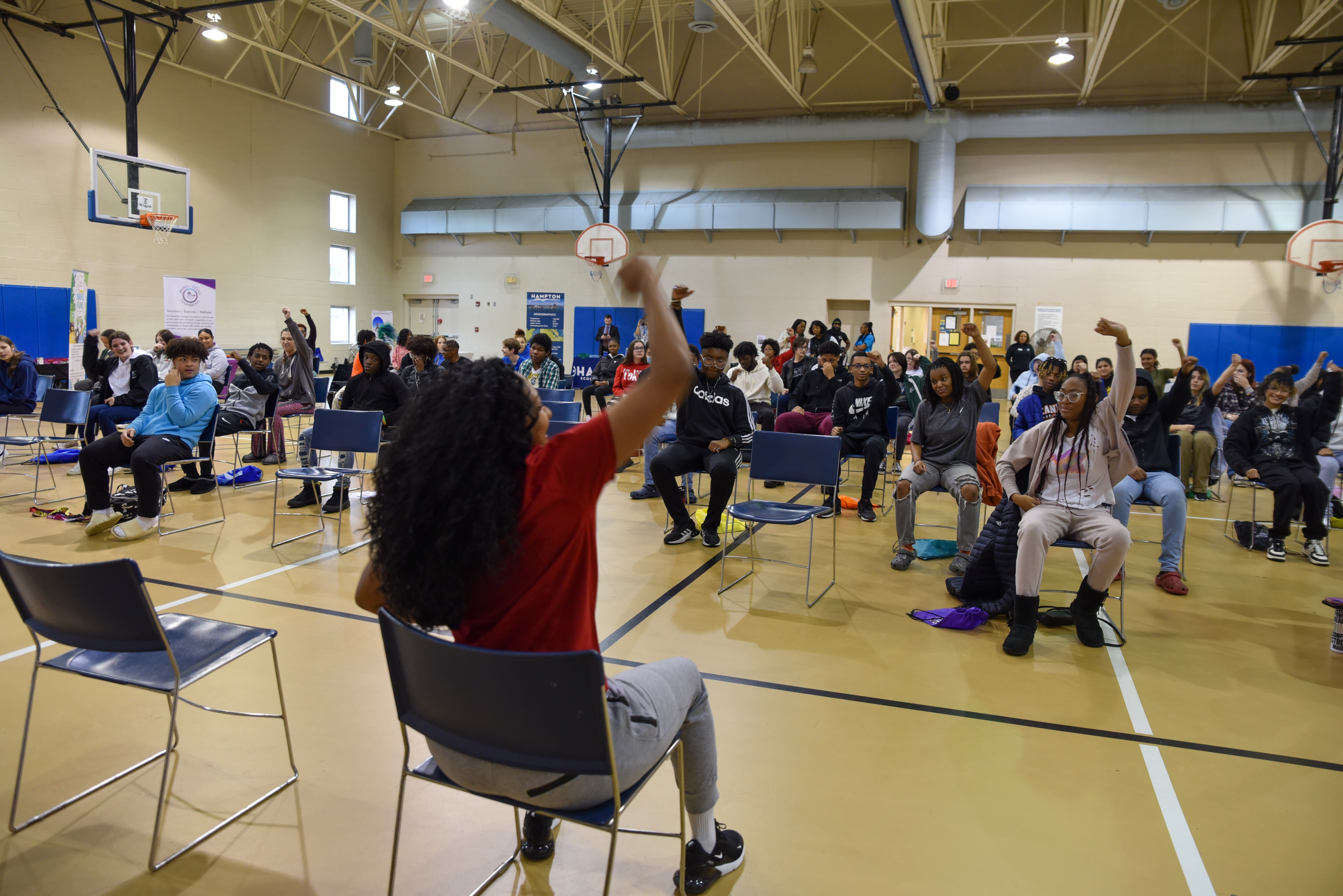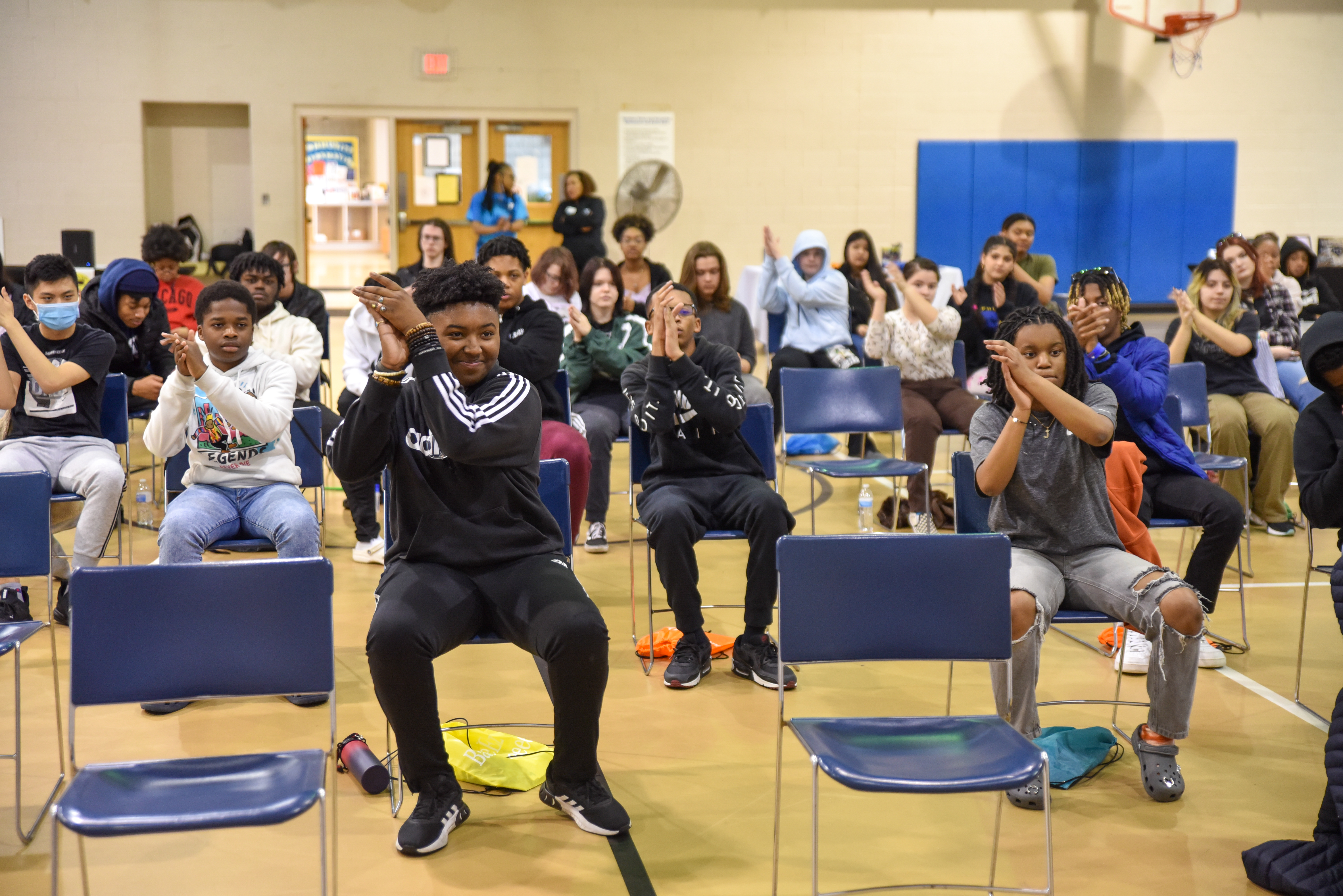 Alexis Perkins-Powell, owner/CEO of Chair One Fitness, toured the four high schools on January 31 and energized students from all grade levels without even having them leaving their seats. Perkins-Powell discussed her professional journey through fitness and how it has afforded her the opportunity to travel and pursue her passion. Through fun music-inspired choreographed fitness, students learned about scientifically created movements designed for people with different abilities while also learning about fitness tools and tips that are useful for students interested in becoming entrepreneurs.